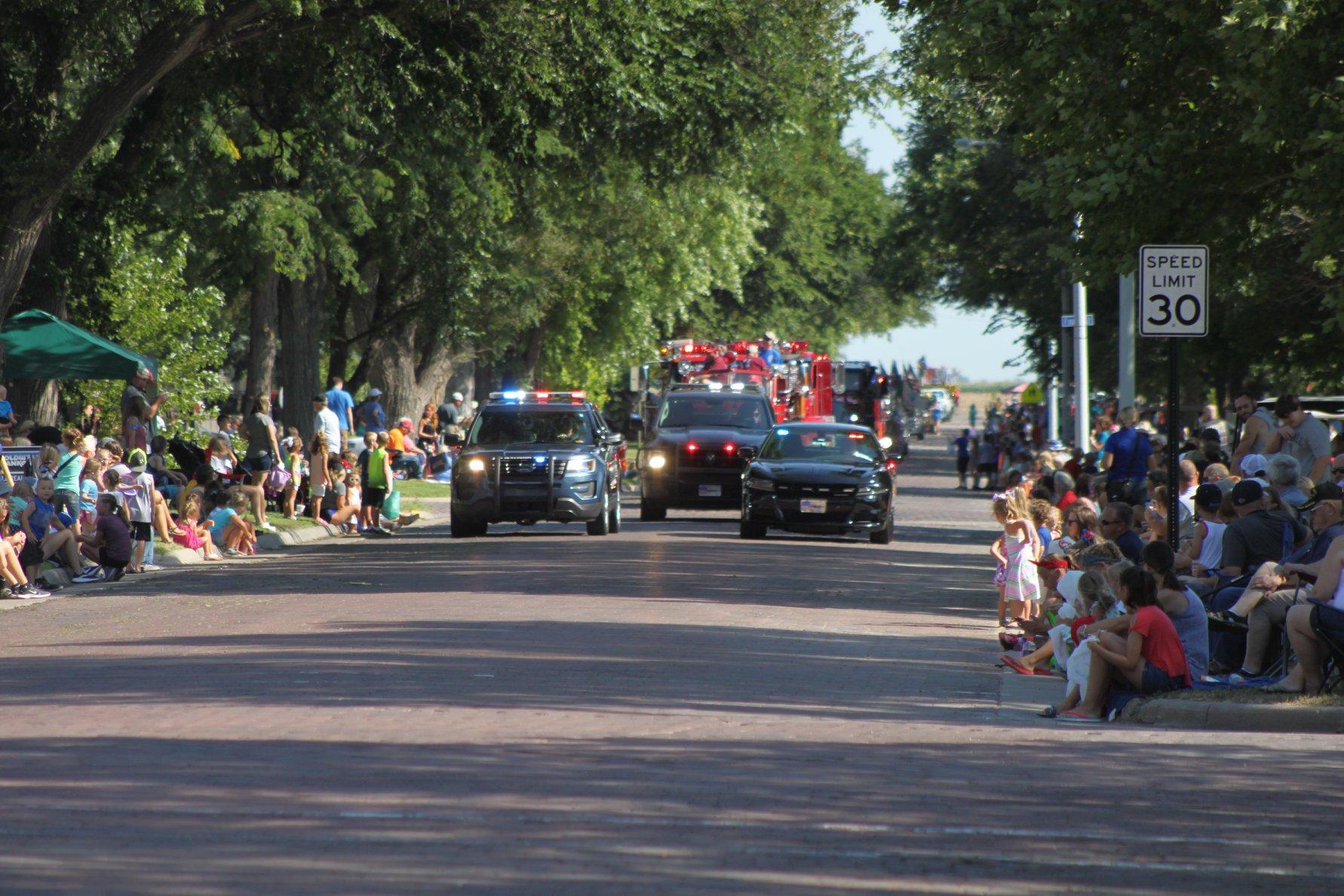 Wide view of the city park with trees in the foreground and play equipment in the background.